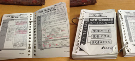 学習の方法がわかった2回目以降は、直前対策講座や行政書士ペースメーカーや模試を受講し、少しずつ学習を継続していきました。振り返れば一番活用したのはスパイラルカードと過去問題集、六法です。特にペースメーカーで使用したスパイラルカードは持ち運べるサイズなので、ポケットやバッグに入れて持ち歩き、時間が空いたら開いて、繰り返し読みました。必要な知識は全てそこに書き込み、それをオリジナルノートとして使用しました。