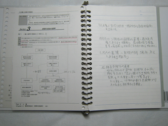 平林講師の受験経験者向け講座はメリハリがあり、講義内容とテキストは内容が凝縮されていました。受験経験者向け講座のテキストは合格講座のテキストと章立てが同じなので、あやふやなところは合格講座のテキストで詳しい解説を参照しました。そして、必要に応じてテキストに書き込み、書ききれない時はルーズリーフに記入して挟み込みました。このテキストをいつも持って、インプットとアウトプット両方に使用していました。