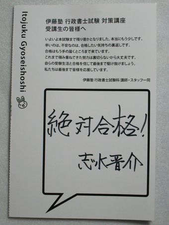 本試験直前にいただいた志水講師の直筆メッセージ入りハガキ。試験前に見て気合を入れました。
