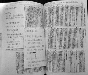 条文素読みで使用した判例六法。重要ポイントをマークしたほか自己流の解釈メモを六法に貼り付けて理解の助けになるように工夫。