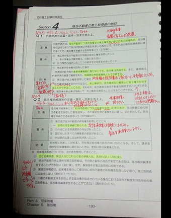 3 ~ 7 月までの間は1ヶ月単位で講義が終わった科目のテキストを1 回復習するように努めました。「行政書士上級コース」の民法、行政法のテキストは300 ページ前後あるので、1 週間で76 ページ程度の量を復習できるように1 日の勉強スケジュールを組みました。1 週間に76ページ× 2 科目復習するだけでも結構な量ですが、「行政書士上級コース」のテキストは暗記すべき知識と過去問が綺麗に一元化されている為、テキストを加工する必要がなく、その分を復習の時間に割り当てられたのがよかったです。そのお陰もあって直前期に入る前の段階で民法、行政法のテキストを3 ~ 4 周程度、復習する事ができました。