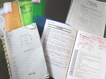 学習に利用したテキストの一部。1 つの教科でも複数講義があったので、教科ごとにファイリングしました。最初はノートや単語帳も試しましたが効率が悪い事に気づき、1 つのテキストに追加知識など書き込み、情報を集約しました。決めたメインテキストは3 回は繰り返して学習しています。「条文徹底解析講義」のテキストは辞書的な利用をし、使い込みボロボロです。