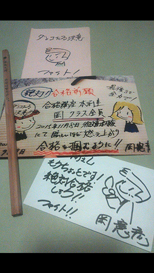 肌身離さず持ち歩いていた、岡講師からのメッセージ。今も、受験票と合格通知と共に大切に保管しています。