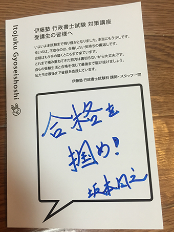 直前期に坂本講師からいただいた応援メッセージが書かれた葉書。届いたとき嬉しくて勉強へのモチベーションが上がったのを覚えています。