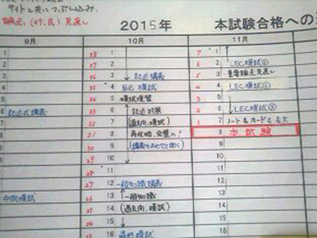 模試や直前講義の日程を書き込み、それに合わせて、週ごとに何を重点的につぶしこむかを明記、一覧にすることで見やすくし、試験までの残り日数も明記してモチベーションアップにもつながりました。