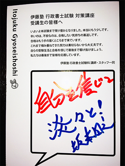 時間的に猶予がない。今年は受かる。そう思い、法律分野に強い指導校として頭に浮かんだのが伊藤塾です。すぐに、東京校スタッフの佐竹さんに講義ラインナップを伺いました。根掘り葉掘りしつこく質問する嫌な私(笑)に、丁寧に、確実に答えてくださったことに、改めて御礼申し上げます。