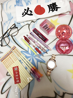 →合格ハチマキは模試のときに腕に巻いてみたらだんだん点数が上がったので、実際に願掛けにと本番は足に巻いてました笑