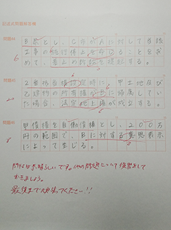 「行政法で満点を取るゼミ」、「記述式書きまくりゼミ(民法編)」を受講しました。解説がとてもわかりやすく端的で、頭の中にすんなりと入ってきました。苦手だった民法を強化すべく受講した「記述式書きまくりゼミ」では、理論立てて考えることを習慣化できました。これは本試験の記述式の回答を解くうえで大変役に立ったと思います。
