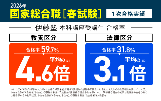 おすすめ講座 ガイダンス体験講義 {"news_id":"17"} ▼ 試験別の合格・内定実績 国家総合職 国家一般職・専門職裁判所・地方公務員 国家総合職(官僚)を目指す 国家一般職・地方公務員を目指す 裁判所事務官を目指す そのほかの講座 国家総合職教養区分<春秋> 国家総合職専門試験区分<春> 国家一般職 国家専門職 裁判所事務官 地方上級 ▼専門アドバイザーが最適プランをご提案 最新情報はこちらもチェック!