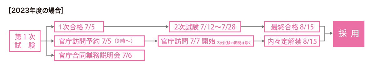国家一般職として採用されるためには、「官庁訪問」で内々定を獲得する必要があります。国家一般職の官庁訪問は、1次合格発表後すぐにはじまります。最終合格が確定していない段階で活動する必要がある、というのが大きな特徴です。試験対策とうまくバランスをとりながら、官庁訪問の準備を早めに行うことが大切です。