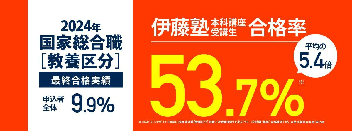 伊藤塾には、国家総合職<教養区分>試験における圧倒的な実績と、確かな方法論があります。あなたも、伊藤塾で教養区分合格、そこからの内定獲得を目指しませんか?