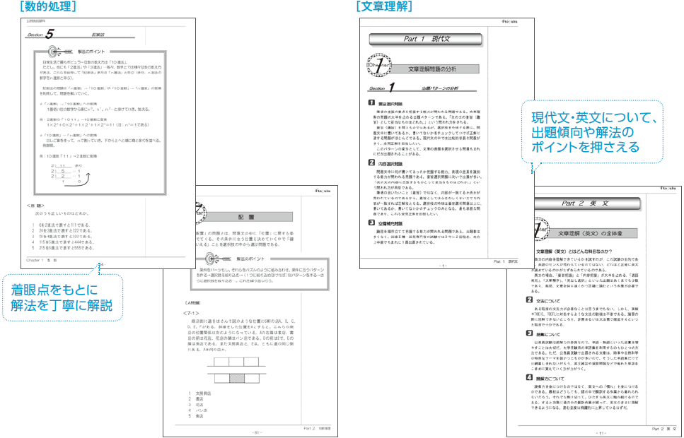 出題数が多く、重点的に対策すべき数的処理分野は、初歩から難度の高い問題まで段階的に講義し、「思考力」を養成していきます。その他の科目は、合格に必要な内容をコンパクトに効率よく講義することで、力を養成します。
