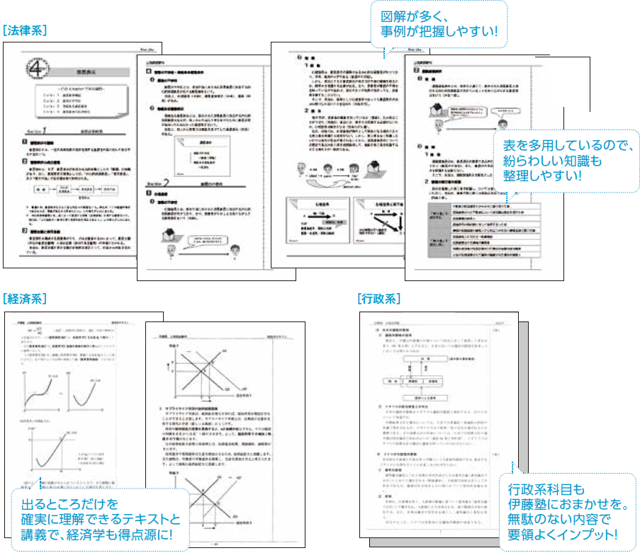 科目数が多い公務員試験では、学習範囲の絞り込みが重要。伊藤塾のテキストは、過去の出題傾向を徹底的に分析し、試験合格に必要十分な情報をわかりやすく整理しています。「知識ゼロでも理解できる」ように工夫しているので、はじめて学ぶ科目でも安心です。