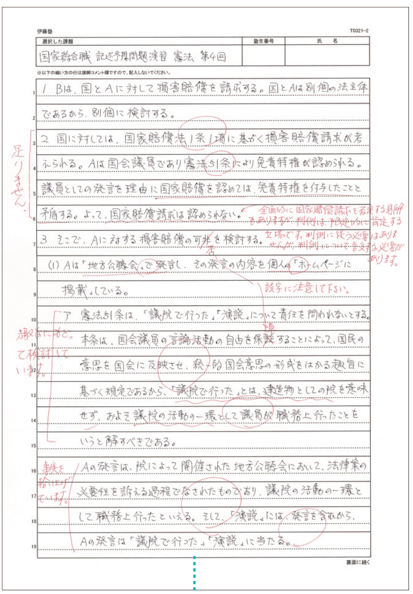 時事講義で掘り下げた行政課題について、実際に答案を書いていただきます。作成した答案は、添削して返却します。後回しになりがちだが、対策に時間のかかる教養論文対策について、着実に知識をつけながら文章を書く力を修得していきます。
