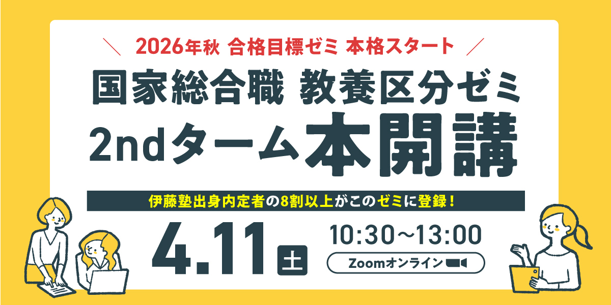 国家総合職ゼミは、対応する試験ごとに「教養区分編」と「法律区分編」の2種類を開講しています。2026年秋の教養区分合格を目指すゼミは間もなく開講します。定員締切間近!入塾をご検討されている皆さんはお早目にお手続きください。