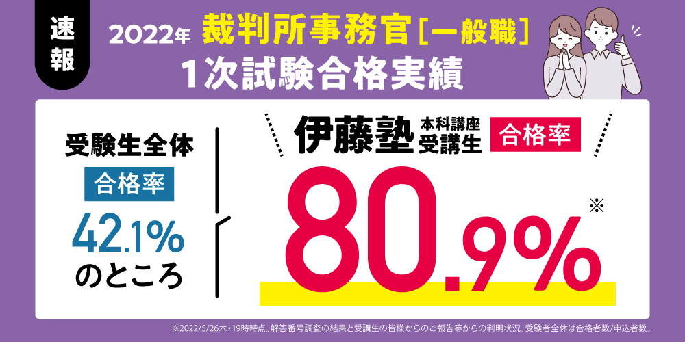 5/26(木)、2022年の裁判所事務官<一般職>試験において、第1次試験の結果が発表されました。今年も伊藤塾の本科講座受講生が多数合格!