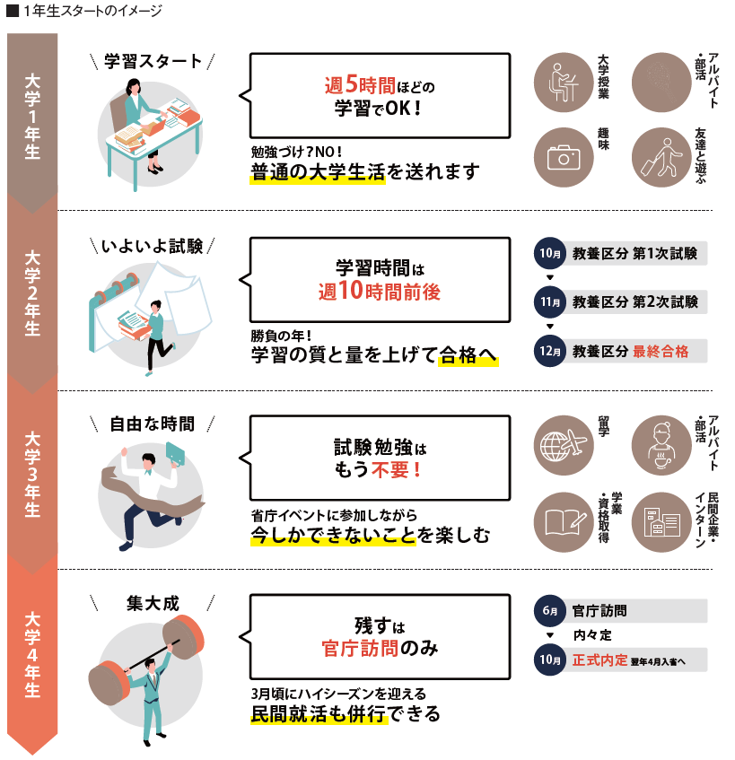国家の主権と国民の生命財産を守るという国家公務員にしかできない仕事がしたかったため国家総合職を目指しました。大学一年冬から、早めに始めたことで余裕を持って試験対策をすることができました。また、省庁の説明会等に多く参加できて内定しやすくなると同時に自分の選択を吟味することができました。