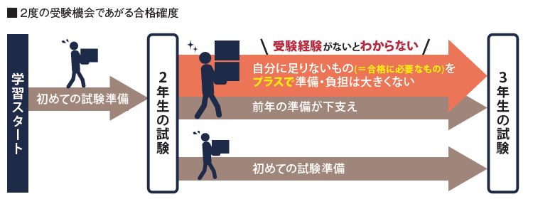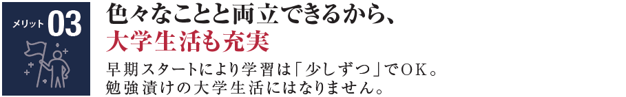 大学2年の5月に学習を開始しました。早めに始めることで、①大学の授業やゼミ、就職活動、プライベートと両立させながら、学習を進められる②長く在籍している分、より多くの情報を集められる、といったメリットがあったと感じました。