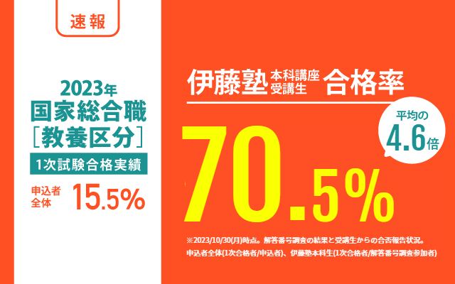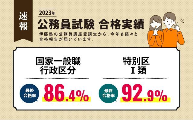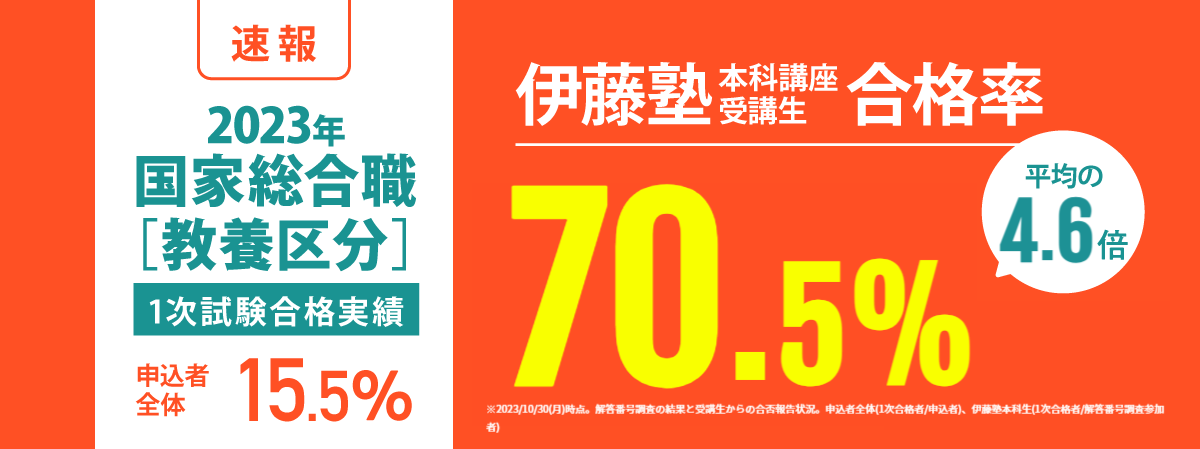 おすすめ講座 ガイダンス体験講義 {"news_id":"17"} ▼ 試験別の合格・内定実績 国家総合職 国家一般職・専門職裁判所・地方公務員 国家総合職(官僚)を目指す 国家一般職・地方公務員を目指す 裁判所事務官を目指す そのほかの講座 国家総合職教養区分<春秋> 国家総合職専門試験区分<春> 国家一般職 国家専門職 裁判所事務官 地方上級 ▼専門アドバイザーが最適プランをご提案 最新情報はこちらもチェック!