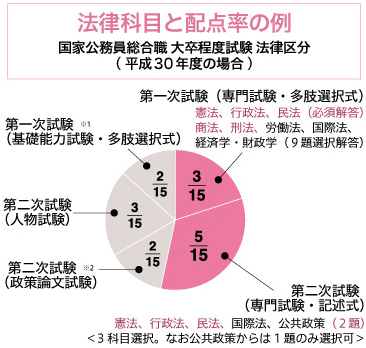 公務員の仕事は、先に触れたように法律を使って国の施策を動かしていく仕事であるため、採用試験にも多くの法律科目が課され、そのほとんどは司法試験や法科大学院入試と重複します。また、法律科目の配点が高いことから、法律学習経験があれば大きなアドバンテージをもって試験に臨むことができます。