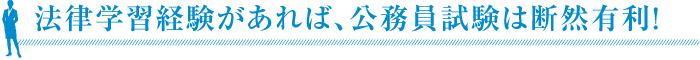 「公務員試験は筆記試験が上位でなければ内定がもらえない」というウワサを耳にしたことがありませんか。受験生にとってはドキッとするお話ですが、これは事実ではありません。公務員試験においては、筆記試験の点数と、その後の面接試験、国家公務員試験の場合の官庁訪問は、まったく別のものとして扱われます。短期間で効率よく学習して合格点をクリアすればよいのであり、上位合格を目指して各教科を完璧に仕上げる必要はありません。その点から、法律学習経験者は大変有利に学習できるといえるでしょう。