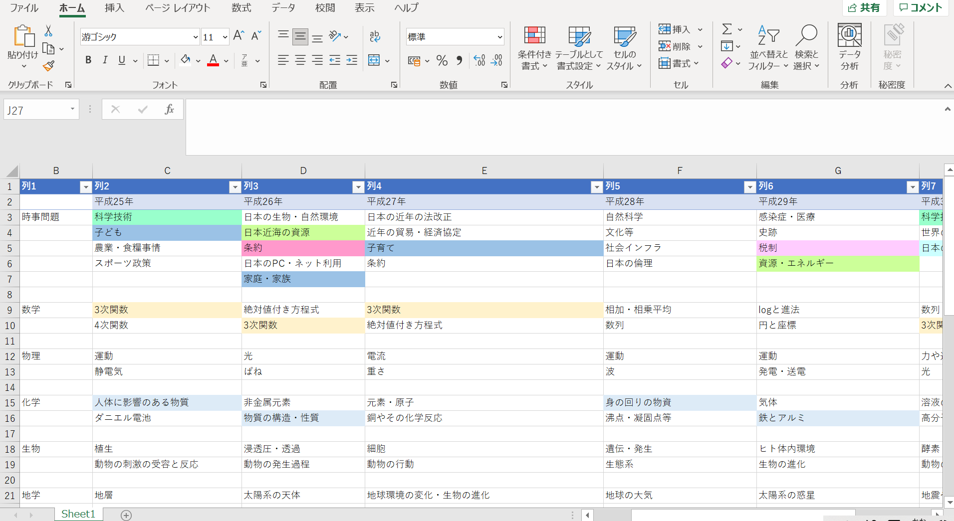 ▲出題内容をExcelで表にまとめ、同じ出題分野には同じ色をつけていた。