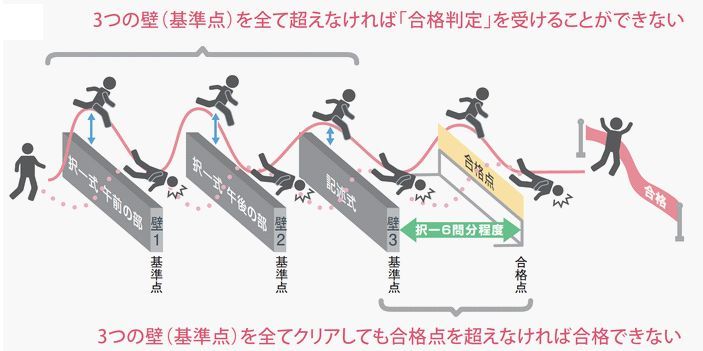 (図2)をみてください。司法書士試験には午前の部択一式、午後の部択一式、記述式それぞれに基準点が設けてあります。つまり、総合得点が合格に十分であったとしても、3つのうち一つでも基準点を下回ると合格することができないのです。