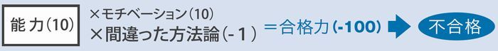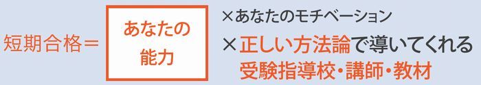 合格力とは能力・モチベーション・方法論の3つが掛け合わさったものであると位置づけています。足していくのではなく、掛け算されていくということです。例えば能力が1であってもモチベーションが10あって、正しい方法論が10あれば合計は100となります。つまり合格できるわけです。逆にいくら能力が10、モチベーションが10あったとしても正しい方法論が-1であれば合計が-100となり、不合格という結果になります。短期合格を考えた場合、合格に直結する重要な要素は「正しい方法論で導いてくれる受験指導校・講師・教材」ということです。