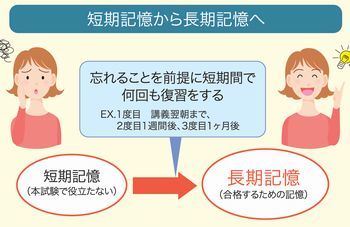 最初から講義内容をすべて完全に理解し、記憶しなければいけないと思う必要はありません。覚える情報が多いだけに忘れることを前提に勉強をする姿勢で臨みましょう。記憶を定着させるためには理想の復習タイミングがあります。1度目は講義を聴いた翌朝までに、2度目は1週間後、3度目は1ヶ月後に復習がよいと一般的に言われています。ここで重要なのはある程度短い期間に何度も復習することで、短期的な記憶から長期的な記憶に変わるということです。短期記憶の知識はあっという間に忘れてしまいますが、長期的な記憶はなかなか忘れないものです。皆さんの身近なところでも長期記憶に切り替わっているケースがあります。掛け算の九九をイメージしてもらえると分かりやすいと思います。なかなか最初のうちは記憶が定着しないことがあったり、定着させる作業があきてしまうこともあるかもしれません。ただ、一人ひとりにあった最適な記憶法がきっとあるはずです。 繰り返し学習こそが合格への最短距離だと思ってがんばりましょう。