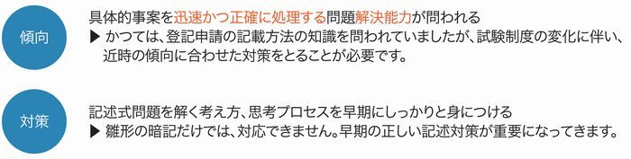記述式の問題は不動産登記法・商業登記法の各1問ですが、それぞれ、関連各法と連動した知識が要求されます。その意味で記述式問題は総合的かつ、応用的な問題であることを認識してください。