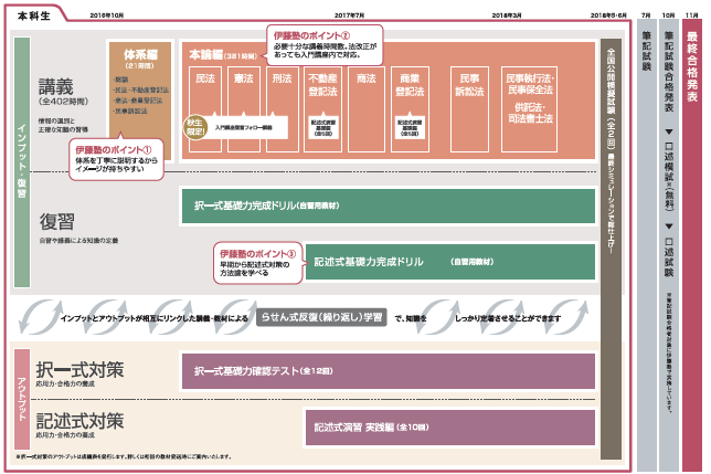 | 択一基礎力確認テスト | 民法3回、不動産登記法3回、会社法・商法・商業登記法3回、 民事訴訟法・民事執行法・民事保全法・供託法・司法書士法2回、憲法・刑法1回 |
