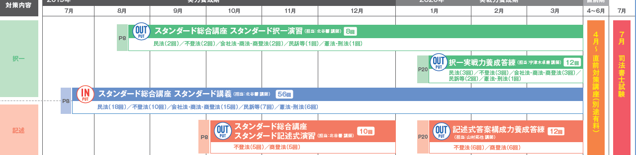 本コースのインプット講義(スタンダード講義)では、初歩から合格レベルまでの情報が網羅されている最新の「入門講座講義テキスト」を使用する一方、講義は2年目以降の受験生向けに、短時間で終えられるカリキュラムになっています。これにより、早期にインプットを終え、反復復習や問題演習に取り組む時間を確保することができます。また、インプットとアウトプットをバランスよく強化できるように、年内から択一式・記述式の演習を行い、年明けの答練に備えます。