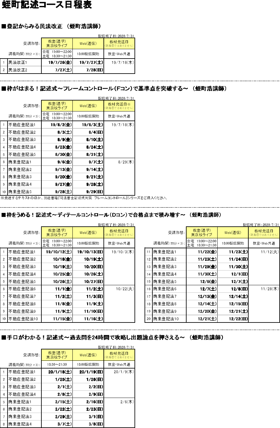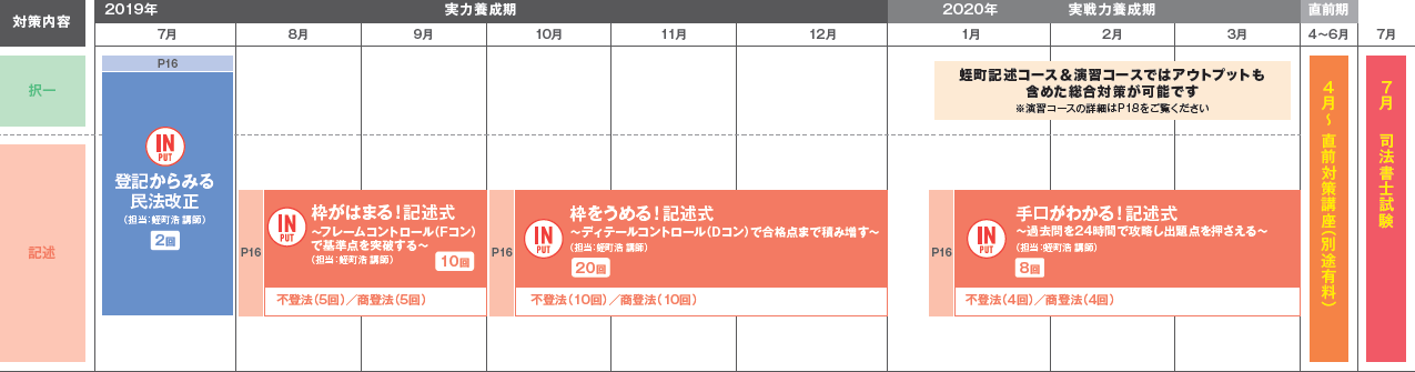 「記述式で一歩およばず」という方が多くいます。こういった方々は、記述式の「攻略法」がわかっていないという傾向があります。その原因は、「基準点突破」のため、さらに、基準点から合格点への「合格点底上」のために必要な学習の区別がつかず「闇雲な勉強」に陥っていることにあります。この際、改正対応を含め、徹底的に記述式対策を考え直してみましょう。まず、最初にやるべき「基準点突破」の学習は、不登法であれば連件申請に対応する「申請の個数と順序の判断」であり、商登法であれば白紙答案を避けるための「暫定答案の判断」で、これをFコン(フレーム・コントロール)といいます。次にやるべき「合格点底上」の学習は、不登法であれば登記事項の書き方や添付情報の判断であり、商登法であれば添付書面とそれに基づく瑕疵判断であり、これがDコン(ディテール・コントロール)です。これらの学習では、書式で初めて導入したABCランク分類により、基本を重視し効率的に学習を進めます。そして、直前準備期(1月~3月)においては、「出題の手口」の観点から過去問を分析し、予想論点の基礎資料を把握することで、出題の絞り込みと知識の精度を高めることができます。蛭町記述式コースは、年間を通じた記述式の対策に万全を期すコースとなります。