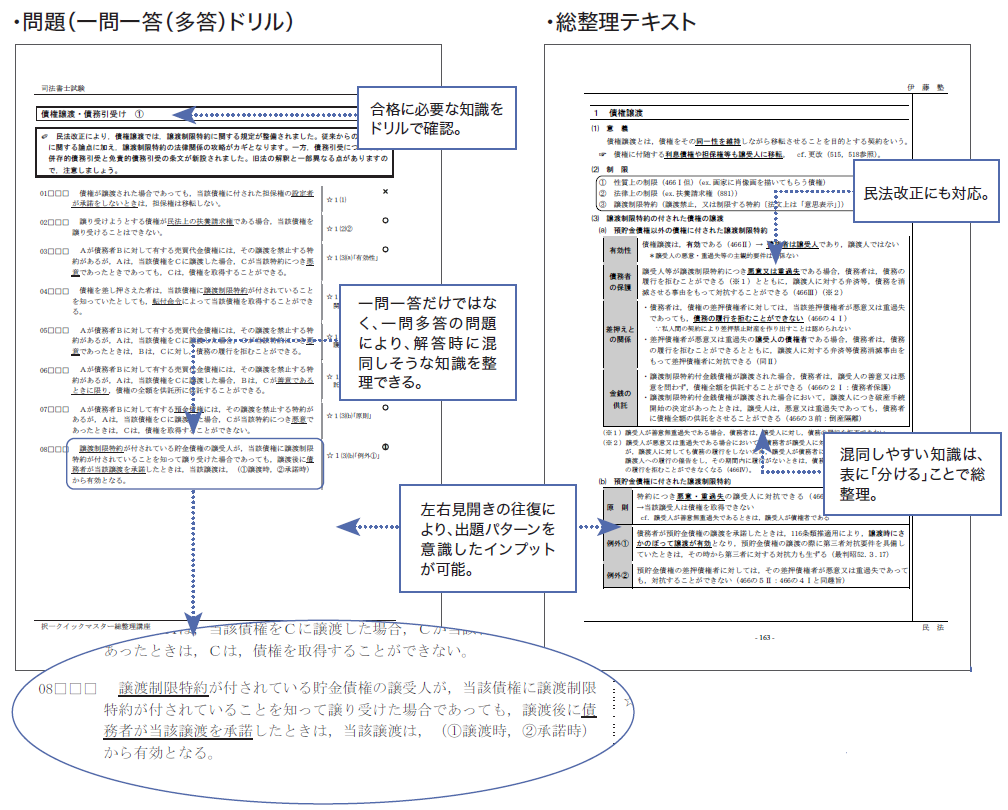 テキストは、左のページに過去問ベースの一問一答式問題、右のページに図表を中心とした知識整理、という構成になっています。これにより、「テキストと過去問集の行き来」という時間をカットでき、かつ、スムーズにインプットとアウトプットを行うことができます。テキストは、全科目含めて、問題と知識整理がそれぞれ約450ページずつにまとまっています。これは、試験範囲全体が「手のひらに乗る感覚」の分量です。このテキストを徹底攻略することで、高速で全科目を総整理することができます。なお、テキストは、①民法をはじめとする法改正への完全対応はもちろん、②最新重要判例・先例の掲載も行い、左右両ページのヴァージョンアップを図っております。