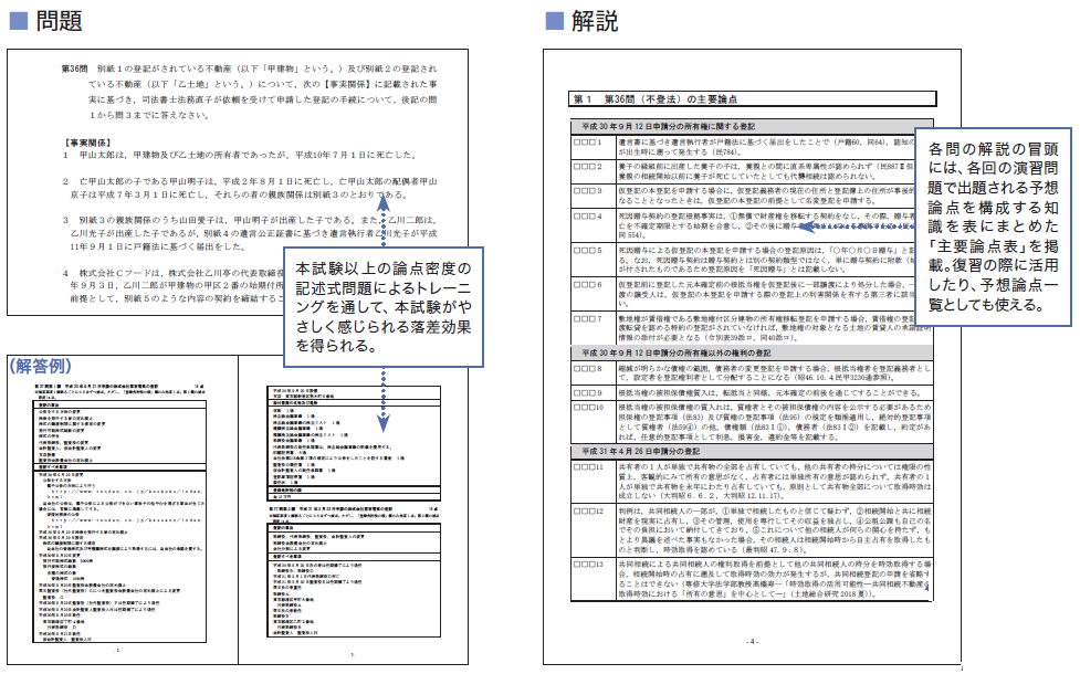 本試験で真に受験生の武器になるのは、量は少なくともに「精度の高い知識」です。この状態を実現するには、予想論点を軸にした大胆な知識の絞り込みが必要です。本講座は、予想問題を不動産登記法・商業登記法「各3問」に絞り込んでいきます。これならば時間が少ない直前期でも「確実にこなせる」はずです。直前期にあることを「やり抜いた」という感覚は、自分に対して大いに「自信」になるだけでなく、試験場での「勇気」に代わります。直前期の不安から、「こなすことができない量」の問題に手を出しがちになる悪循環からぜひとも脱却すべきです。