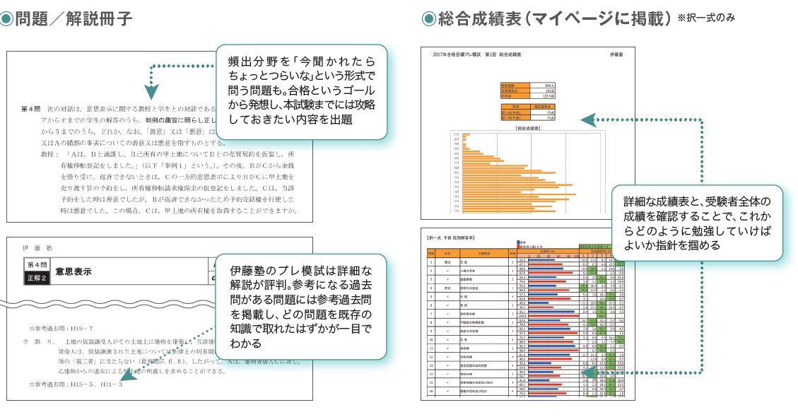 直前期は司法書士試験の天王山といえるほど重要な時期であり,この時期の学習効率が合否を分けると言っても過言ではありません。そして,直前期の学習効率を左右するのは,事前に組み立てる直前期の学習計画であり,これは自分の現在の実力を正確に把握した上で組む必要があります。そこで,このプレ模試は,実力診断の機会として直前期の入り口の時期に,本試験レベルの新作問題で実施します。ぜひプレ模試を活用して,直前期の学習計画の足掛かりとし,学習効率を最大限に引き上げていきましょう。