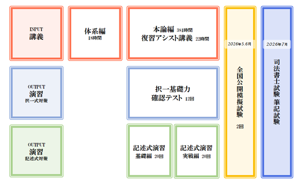 週3回の決められたスケジュールの講義に沿って着実に実力を身に付けることができます。また、講義では講義内容はもちろん、学習スケジュールの組立て方やメンタル面のサポートなど充実しているため、まさに司法書士試験の合格に必要な要素が「オールインワン」になっているコースとなっています。