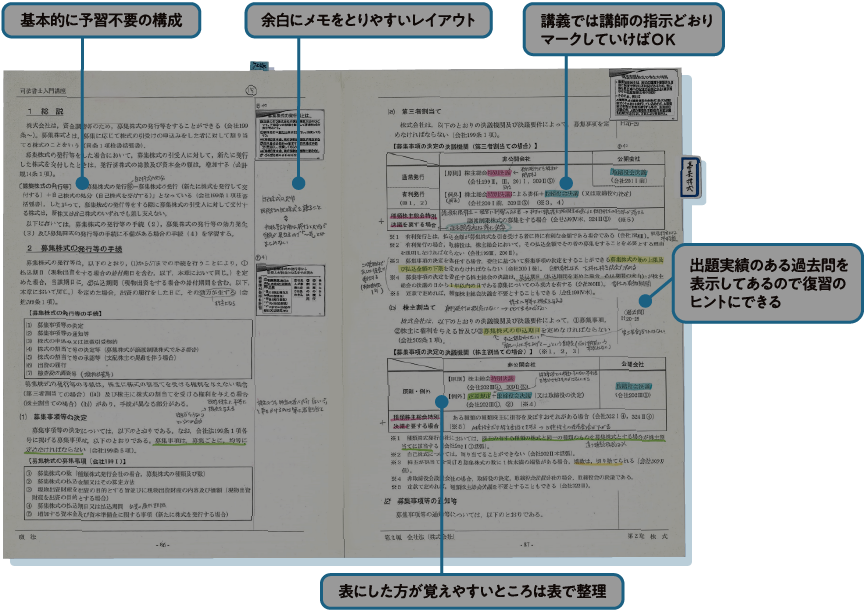 一色刷りのシンプルなテキストなのでポイントをマークした箇所も目立ちますし、余白にメモを取りやすいレイアウトも良かったです。講師がマーク箇所を指摘してくださるので講義のときはその箇所を、復習や問題演習のときに自分で 必要なマークを増やしていきました。また講義で使用されるパワーポイントレジュメも必要に応じて該当箇所に貼り つけて一元管理しました。最終的にマークや書き込みが多いページとあまり手を入れていないページができ、メリハリのきいた自分だけのテキストになりました。