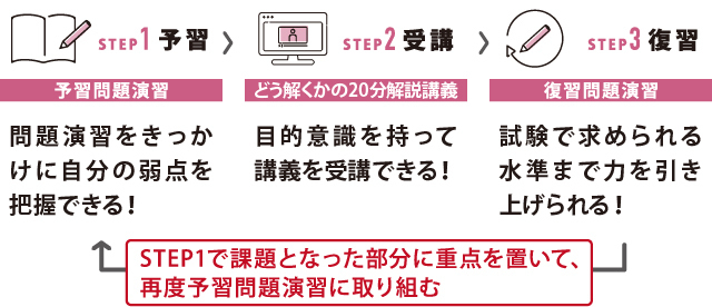 本講座は、問題演習(予習)→講義→問題演習(復習)のサンドイッチ形式の受講形式で自然に実力をつけていくことが可能です。
