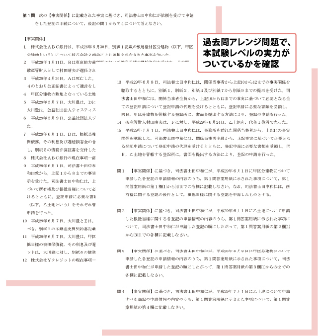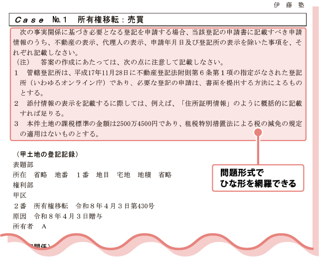 ● 不動産登記法では本試験で出題が予想される雛形を素早く正確に書ききるスキルをマスター!商業登記法ではすべて登記できると判断した場合の答案(=暫定答案)を素早く正確に作るスキルをマスター!