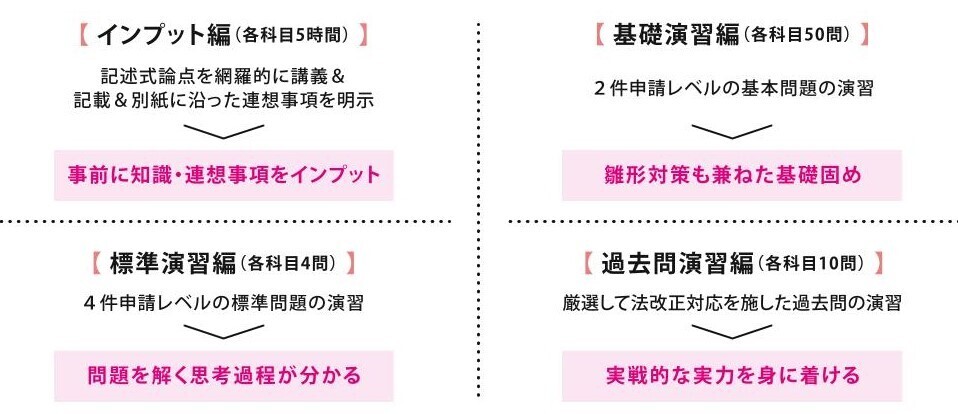 「インプット編」では、記述式における重要論点を本試験の出題例を示しながら学習するとともに、『○○が来たら、△△と□□を連想する」といった連想事項を習得します。ここで習得した知識及び連想事項をこの後の各編でアウトプットする構成となっているため、手持ちの知識に不安のある方でも、実のある問題演習に繋げた学習を行うことが可能です。