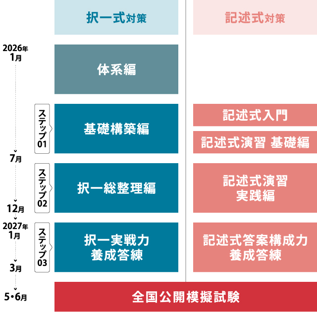 実践編では、本試験に近いレベルの問題に取り組んでいき、本試験の現場でその知識をどう使えばよいのかという「スキル」を獲得し、記述式対策の最終目標である『制限時間内に「合格答案」を書き上げる「解法パターン」』を確立します。