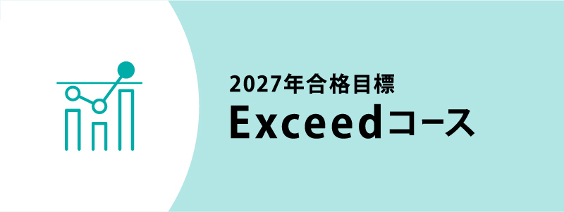 これまでの学習経験を最大限活用し、合格ラインを超えることを可能にするのがExceedコースです。本コースは基礎から応用(発展)へと、段階的にカリキュラムが進行します。それぞれのパートにおいては、明確な目的をもった「講義・教材」により「わからない」「覚えられない」といった多くの受験生が抱える課題を克服できるようになっています。また、本コースはバランスよくコンパクトに収まったオールインワンのカリキュラムとなっているため、「やりきれない」といった消化不良に陥ることなく、効率よくご自身の力を伸ばすことができます。