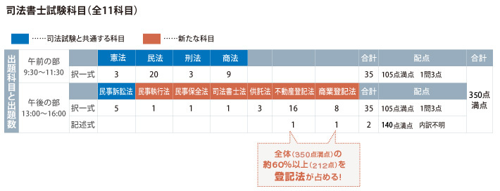 司法書士試験の11科目(全70問)の択一式試験問題のうち、憲法(3問)、民法(20問)、刑法(3問)、民事訴訟法(5問)、及び商法(9問)が、司法試験と共通します。司法試験合格に向けた学習経験のある方であれば、憲法、民法及び刑法について、十分なアドバンテージがあります。
