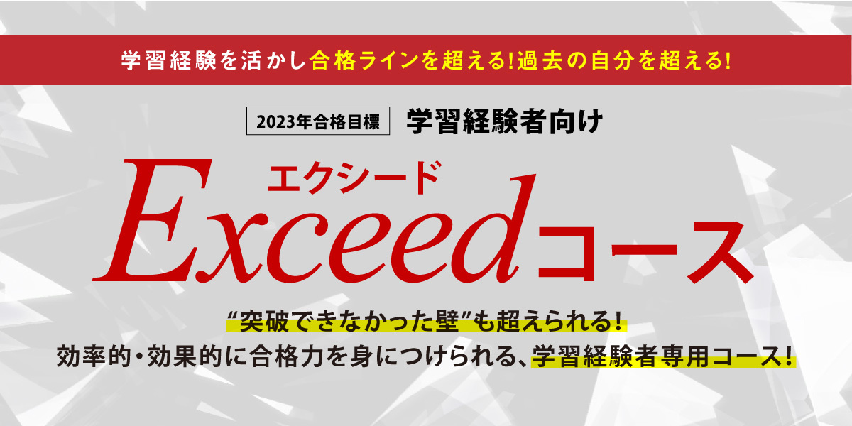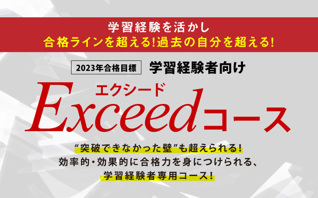 『Exceed(エクシード=超える、勝る、卓越する)コース』は、「学習経験を活かし、合格ラインを超える」をコンセプトにした、法律の学習経験がある方のためのコースです。