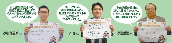 教室・Web受講にかかわらず、講義内でのメッセージ、講義後の質問受け、講師との対面・電話によるカウンセリングを通じて、小山講師が勉強開始から合格まで皆さんをサポートし続けます。講義中は皆さんに向けたユーモアあふれる言葉を通してモチベーションアップ。その他、くじけそうになったときに、小山講師の冷静で、時に厳しくも情熱溢れる励ましを受けることで、合格に向け勉強する元気を取り戻す受験生も少なくありません。