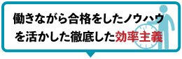 自らが社会人として働きながら合格した経験をもとに、 可処分時間が少ない受験生でも効率的に学習ができるように、学習範囲を大胆に絞り込みます。
