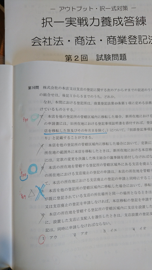択一の演習コースの問題で引っかかった肢は、回数ごとに色を変えて何度もチェックしました。基本書とリンクできるようページ数を書き込んで、基本書にもその都度往復するようにしました。