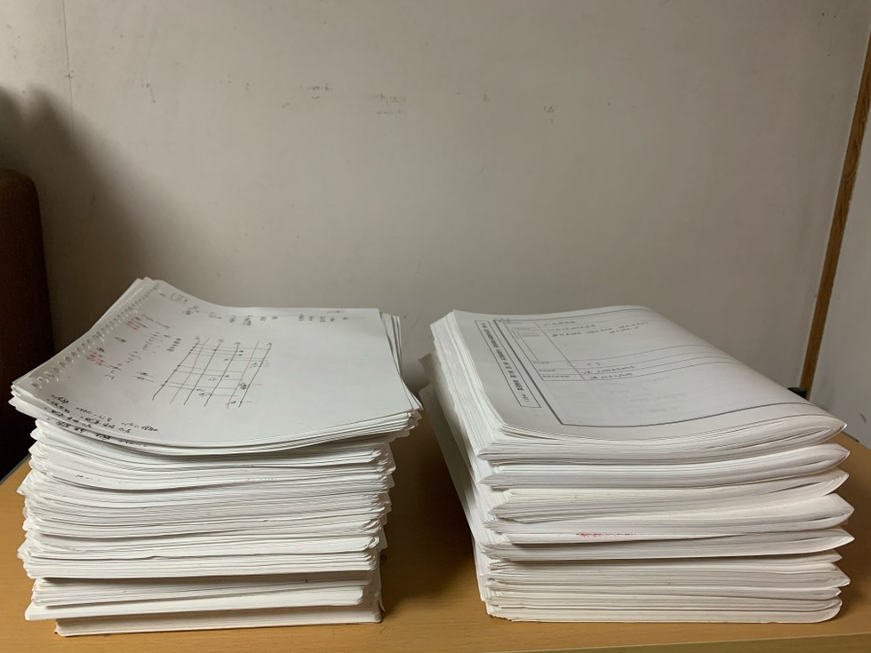 記述の勉強の跡です。左が答案構成用紙で、右が答案用紙です。厚さは、約12cmでした。