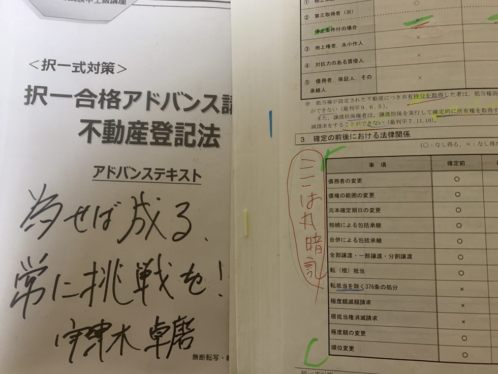 合格報告会で宇津木先生にお会いしてテキストにサインしていただきました。先生の講義では常にラインを引かされるので休む間もありません!